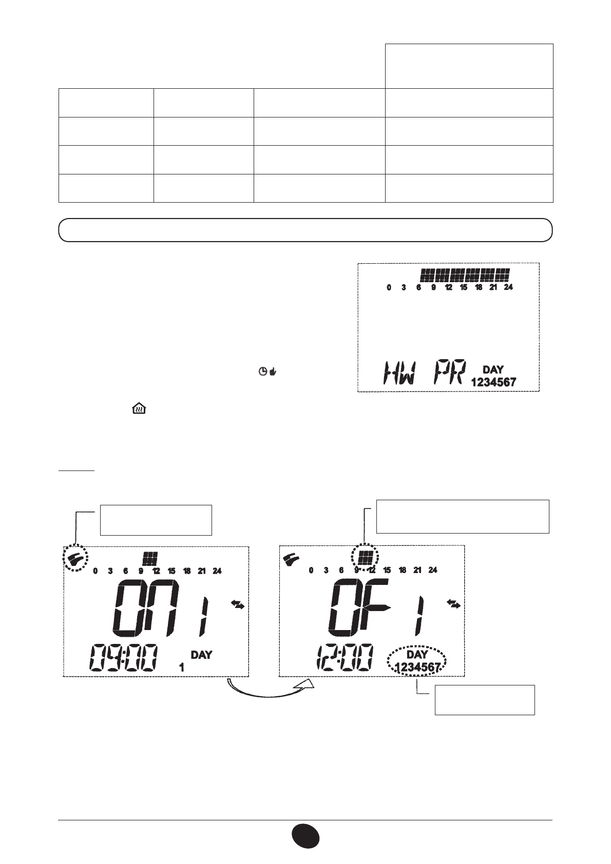 - 9 Сводная таблица программируемых групп дней; установленные; с понедельника до пятницы; DAY 6 7; суббота и воскресенье; ПОЧАСОВАЯ ПРОГРАММА РАБОТЫ КОТЛА НА СИСТЕМУ ГВС