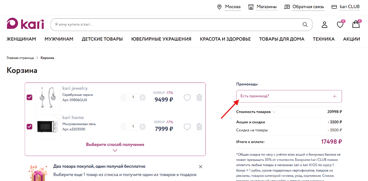 Процесс ввода промокода в системе Кари максимально прост. После того как все товары добавлены в корзину, покупатель переходит к этапу оформления заказа. В этом разделе есть специальное поле для промокода. Нужно аккуратно ввести комбинацию символов, после чего система пересчитает итоговую стоимость. Если код активен, скидка применяется автоматически, и покупатель сразу видит новую сумму.
